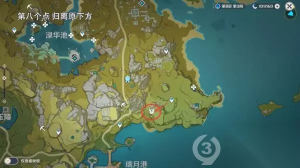 第八个位置 归离原传送到图中传送点后,往路线方向跑即可,注意这个位置是在山顶上