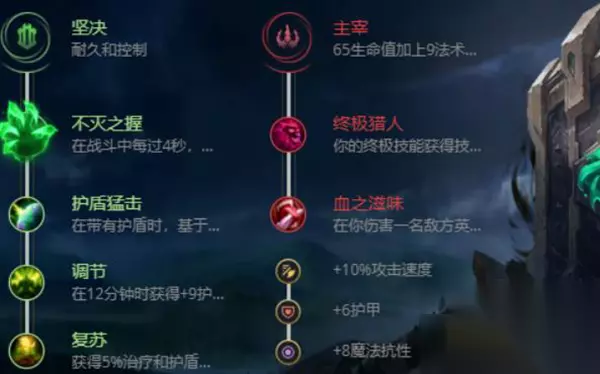 主系:坚决(不灭之握、护盾猛击、调节、复苏) 副系:主宰(终极猎人、血之滋味)