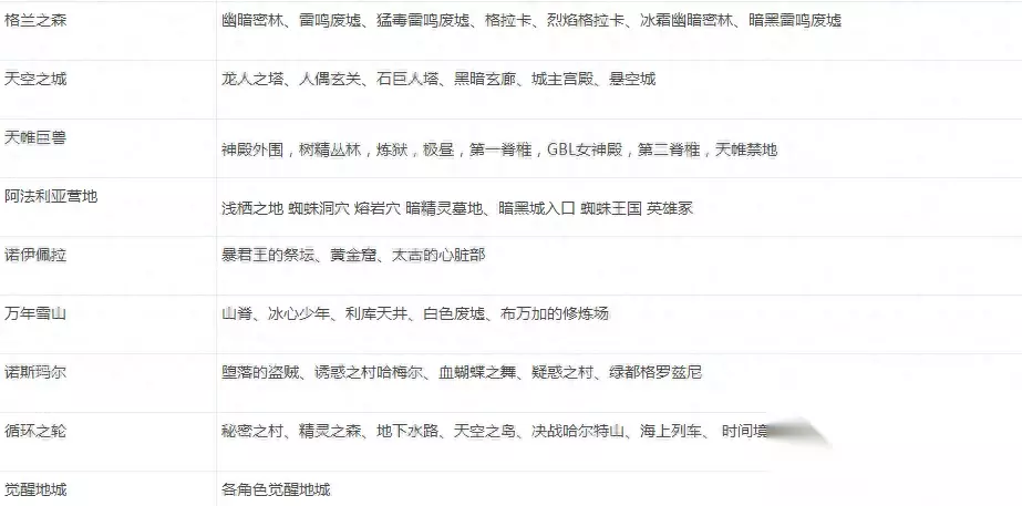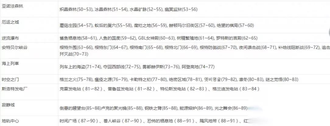 两个平行世界相互整合,地图的等级难度也要调整了。50级之前还是当年熟悉的那些图,格兰之森—天空之城——天帷巨兽——阿法利亚营地——诺伊佩拉——万年雪山——诺斯玛尔。大家可以去重温一下当年的感觉。