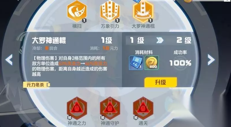 专属技能 横扫:【物理伤害】对所有距离为1的敌方单位造成67%(1级)攻击力的物理伤害(该技能不受攻击距离加成影响) 元力技能 万象引力:冷却4回合,消耗6元力。【位移】将四方向距离自身2格的所有敌方单位拉向自己并造成42%(1级)攻击力的物理伤害,附加移动等级-1,还需1回合。 元力必杀 大罗神通棍:冷却6回合,消耗10元力。【物理伤害】对自身2格范围内的所有敌方单位造成63%(1级)的物理伤害,距离自身越近造成的伤害越高 被动技能 神通之力(被动,30级解锁):战斗中每击杀1个敌方单位暴击率提高6%,暴击程度提高6% 神通守护(被动,70级解锁):对生命值少于50%的敌方单位,伤害提高3% 通天(被动,100级解锁):扩大自身普通攻击的范围,受到的物理伤害降低2% 综合技能以及此前测试的反馈来看,凹凸世界手游嘉德罗斯强度算不上顶级,本身并不缺输出,但元力技能消耗大,万象引力6,大罗神通棍10,对战棋游戏来说,这种消耗大的输出型角色不是很适合。当然,不能非此即彼,嘉德罗斯也不是S卡之耻,作为开测首个限定UP池,也是可以抽到手就用的,新人开荒绰绰有余了。