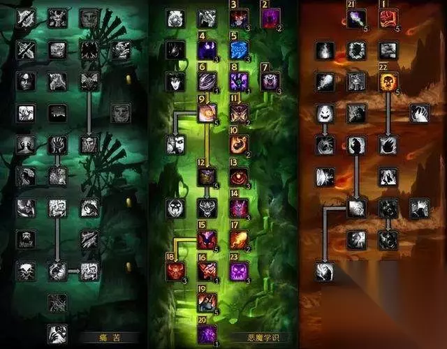 恶魔 56恶魔学识/ 15毁灭 (命中达标17%后,属性优先级为法术强度>急速>精神>爆击) 下面是天赋示意图,图标左上方的数字为点天赋的顺序。