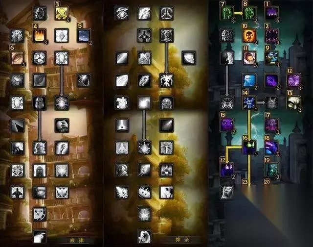 牧师 暗牧 13戒律/58暗影(在命中达标11%的情况下,各属性收益如下:法术强度>急速>爆击>精神>智力) 先点出8点暗影,然后点出13点戒律,再点出暗影剩余的点数。下面的是天赋示意图,图标左上方的数字为点天赋的顺序。