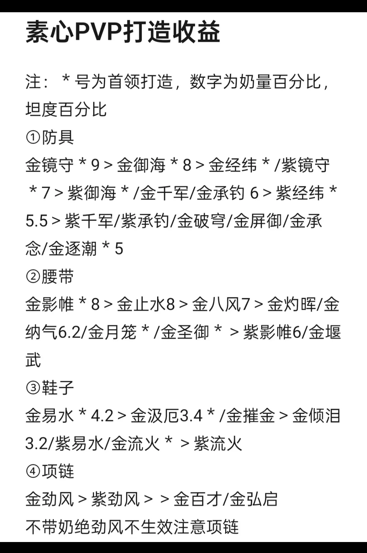 #逆水寒手游新赛年 #逆水寒手游 #逆水寒素问 打造优先级:项链劲风>腰带止水/八风>衣服袖子 不带奶绝不打造项链注意继续带上赛季百才 注:*号为首领打造,数字为奶量百分比,坦度百分比 ①防具 金镜守*9>金御海*8>金经纬*/紫镜守*7>紫御海*/金千军/金承钓 6>紫经纬*5.5>紫千军/紫承钓/金破穹/金屏御/金承念/金逐潮*5 ②腰带 金影帷*8>金止水8>金八风7>金灼晖/金纳气6.2/金月笼*/金圣御*>紫影帷6/金堰武 ③鞋子 金易水*4.2>金汲厄3.4*/金摧金>金倾泪3.2/紫易水/金流火*>紫流火 ④项链 金劲风>紫劲风>>金百才/金弘启 不带奶绝劲风不生效注意项链 ⑤素心PVP非首领打造 ——武器不打造依旧灼墨 ——防具(衣服/袖子)收益每个部位收益高了百分之1.5比上赛季破穹屏御 ——腰带金止水2收益,八风1收益 鞋子金摧金比上赛季(紫汲厄/金霜踏)高0.6 ——项链奶绝超标打造劲风奶量能高百分之3.5,比上赛季百才(本赛季弘启)高百分之2奶量 ⑥☞素心PVP非首领打造: 优先级:奶绝项链2收益>防具两个非首领打造(千军/承钓)1.5收益>腰带止水八风1.5收益>鞋子0.6(摧金) 鞋子还能省材料(燃心打首领打造紫易水就是毕业)鞋子也不打造的 ⑦☞素心PVP首领打造: 超标防具打造(镜守+御海),两个打造加起来收益比两个非首领高百分之5,这里差距非常大 还有腰带影帷高百分之2 一个玩家全身非首领打造和首领打造差距最高能到百分之7,上赛季打造差距不到百分之2