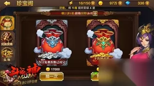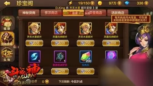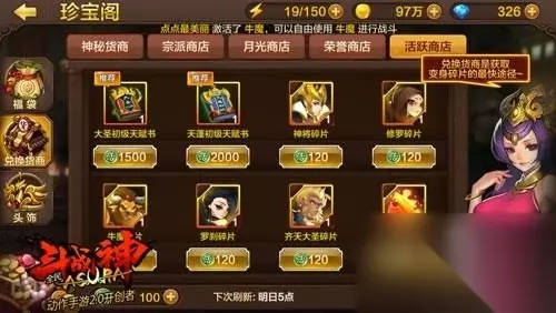 活跃商店中出售的都是和72变有关的道具,我们能够买到神将、修罗、罗刹、牛魔、齐天大圣的碎片,还可以购买到齐天大圣和天蓬元帅的初级天赋书。 珍宝阁系统大致就是这些了,缺少变身碎片的玩家可以通过珍宝阁来获取哦。