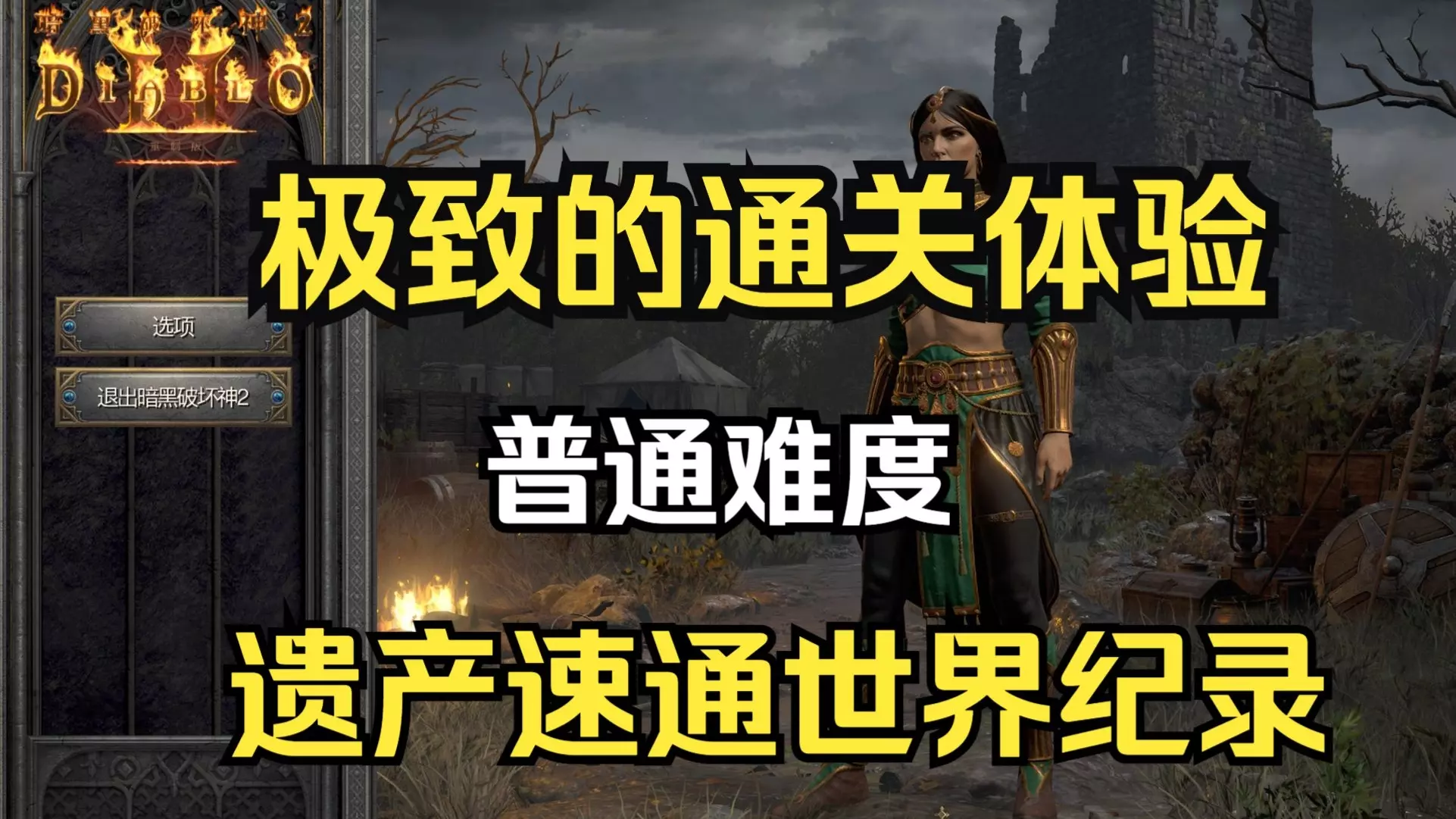 这是2楠解说的《暗黑2重制版》内容,展示了亚马逊遗产速通世界纪录的普通难度部分,该速通耗时1小时59分,呈现了游戏内的闯关过程与相关界面信息。