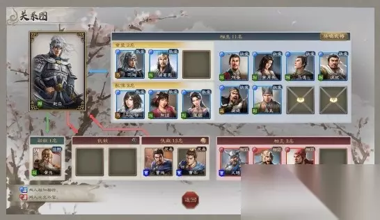 在关系图中可以确认与主角关系匪浅的武将。 若关系交好,在许多场合都将获得莫大的好处。此外,还有宿命(相生或相克)这种特别的关系。 进行交流、宴会或一起执行内政命令,都可以提升亲密度。 亲密度分为七个阶段:厌恶<无视<未知<相识<好感<信赖<敬爱。 亲密度提升后,可在任务或训练中将获得协助,还能结为金兰或配偶等特殊的关系。 仅限未曾谋面的武将,其亲密度为“未知”。一旦相遇便不再是未知。
