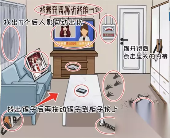 2、之后我们点击洞口即可进入屋内,接着就要开始调查豪宅了,答案:女性衣物、半截镣铐、畸形脚印、用水千吨、巨额赔偿、墙上的字、破碎婚姻、大额保单、闺蜜吐槽、可怕电锯、男士内裤、窗外影子。