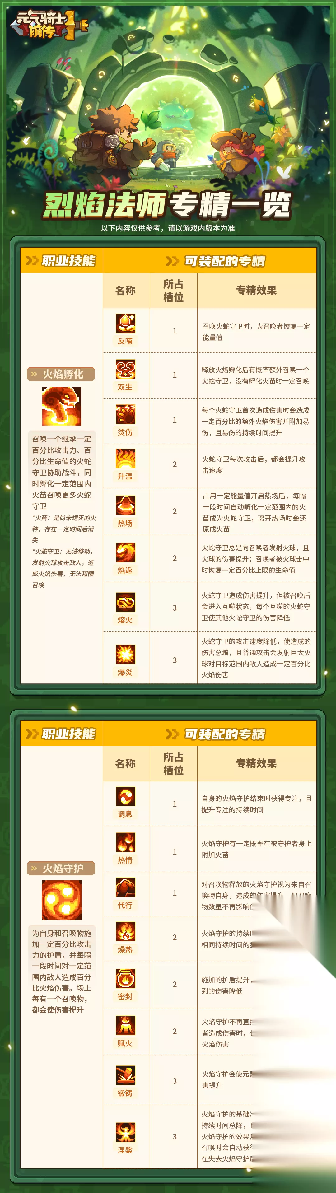 烈焰法师、风暴守卫的专精详情可查看下方长图~ 一、烈焰法师 烈焰法师的【聚灵术】专精详情可见“德鲁伊职业专精一览”长图,【火焰转移】专精详情可见“火焰骑士职业专精一览”长图。