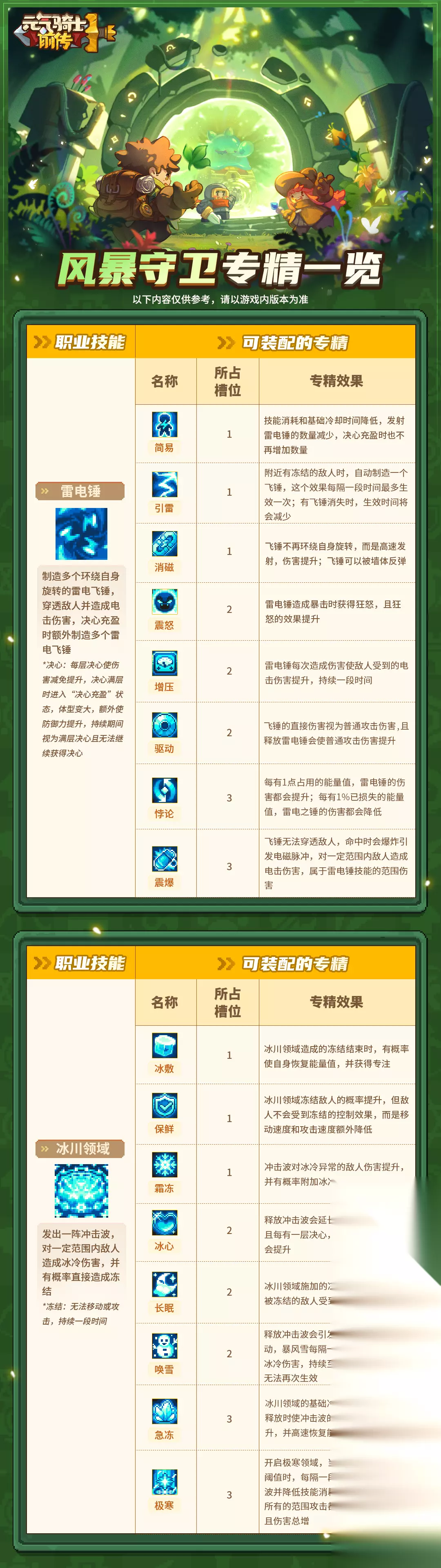 二、风暴守卫 风暴守卫的【冰锥术】专精详情可见“元素法师专精一览”长图,【盾牌冲锋】专精详情可见“领主职业专精一览”长图。