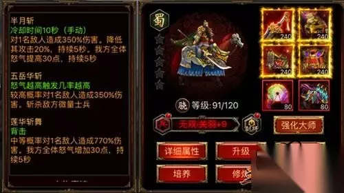 鬼神吕布 逆天存在 伤害技能还有一个,就是恢复自身攻击1159%的生命,这个和主动技能配合起来,是不是可以用“天衣无缝”或是“强强联合”来形容。在1159%伤害的基础上增加20%来恢复成血,我想他与死亡无缘吧?敌方会不会被折磨到砸电话呢?吕布真不愧是战神,三国武将排第一,名副其实。 【武圣关羽 威震华夏】 再来看看关羽,关二爷还是非常威武的。技能是对敌人造成350%伤害,还降低其攻击20%,果然敌人看见二爷都会瑟瑟发抖。前面讲过,越是百分比的伤害收益越大大。战斗一开始就给对面战斗力减20%,这是什么概念呢?如果是我,我都没有跟他战斗下去的勇气了,对于骁将来说,关羽拥有这个技能就是可以突破敌方阵型的最强有力的盾牌,真的不掉血。