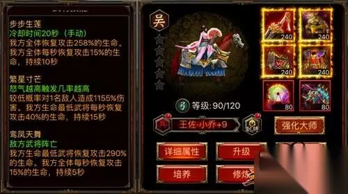 军师孔明 运筹帷幄 吕布就是以高伤害著称,诸葛亮的技能和吕布搭配起来更是完美。对敌人造成770%的伤害,并降低其免伤20%,持续时间10秒。大家会不会迷惑了,什么叫降低免伤20%,意思就是对面如果有BUFF或者装备、技能一些能给自己增加免伤,或者回避的概率。这些都是阻挡我们秒杀或者大量输出的最大阻碍。 【奶妈小乔 女神光环】 自身在肉,再加BUFF什么的也不如有个号称“三国最强奶妈”在身边有安全感吧?而且这个超级奶妈不光保障你的生命安全,还会为你分担相当一部分的输出压力,在她面前你就放心的输出,因为你有最强的后盾。她就是小乔,号称《三国群英传-争霸》最强的奶妈。来看看技能吧,对我方全体恢复攻击258%的生命!这是爆发恢复,接下来还恢复我方全体每秒攻击15%的生命,持续10之久。这奶量实在巨大,而且修炼还有加成,想死也真的不容易啊~