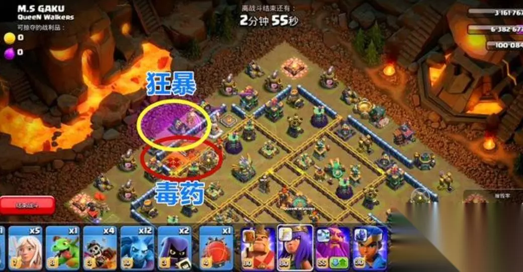 部落冲突全球总冠军挑战打法 一、把视野拉到敌方“蛮王和女王”的身上,在他们的脚下释放“毒药法术”在找到阵型的中心点释放一个“狂暴法术”如果找不好中心点,那我们就以敌方“咏王”和“天鹰火炮”为参照物,这个点就是阵型的中心点。