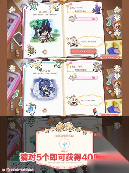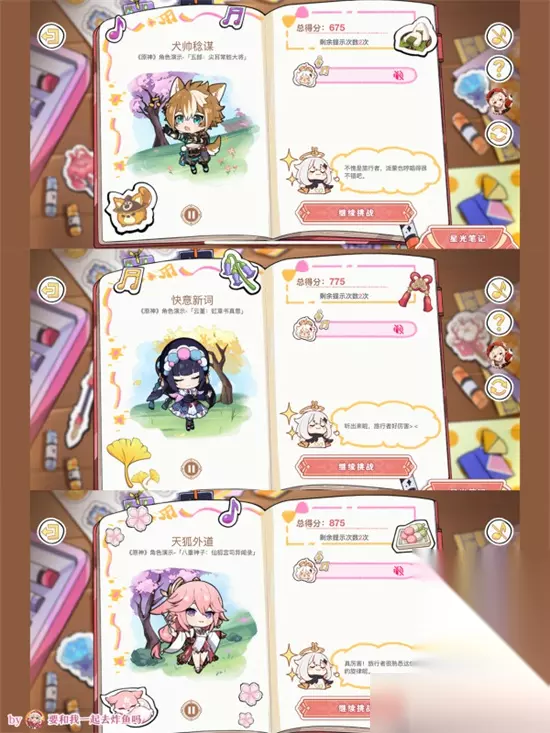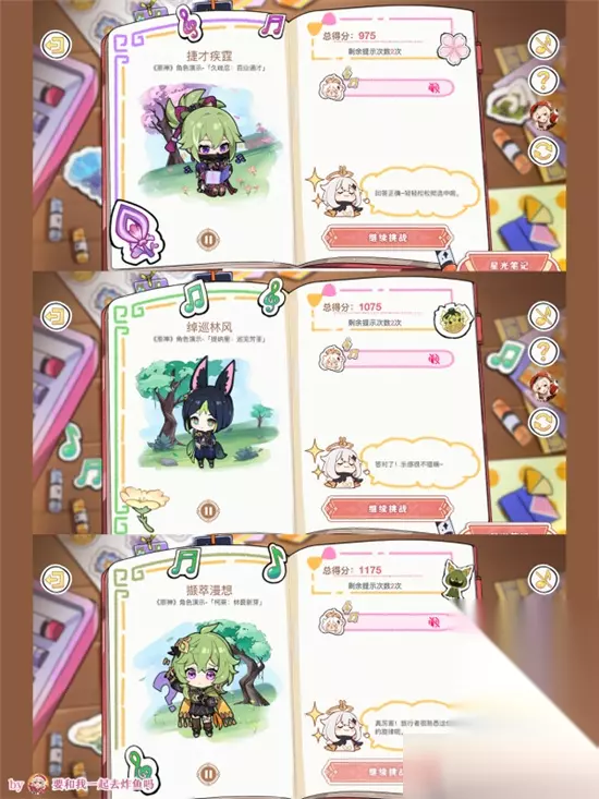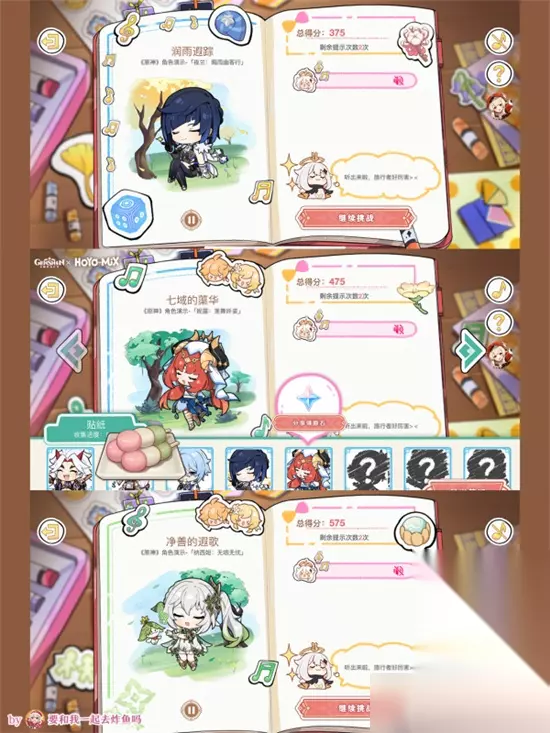 听歌答案文字版: 手牵手的小人+四叶草=纳西妲 黄色花+帕蒂沙兰=妮露 海灵芝+三彩团子=绫人 蓝色+骰子=夜兰 黄色+红色花(血斜)=荒泷一斗 浅紫色(琉璃袋)+霓裳花+雪花=申鹤 饭团+狗狗=五郎 红色花(血斜)+樱花=鹿野院平藏 浅蓝(论文)+冰球=莱依拉 深蓝+椰树+(仙人掌)=坎蒂丝 蓝色(海灵芝)+鸣草=久岐忍 墨绿(科里安巴)+音符=科莱 黄色+银杏+琉璃袋,霓裳花=云堇 三彩团子+狐狸=八重神子 紫色(神灯壶,灯神)+金币=多莉 绿色(诱捕球)+黄色花=提纳里 深紫(秘仪狼头)+圣甲虫=赛诺 听歌答案图片版: