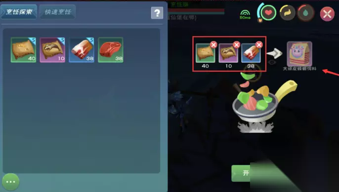 材料准备完毕后,需使用烹饪锅进行最终合成。将优质肉、弹涂鱼饲料包和黄豆饲料包放入烹饪锅,点击开始烹饪即可获得小顽皮蝾螈饲料。每次烹饪消耗一组材料,产出固定数量的饲料包。建议一次性准备多组材料以提高效率。