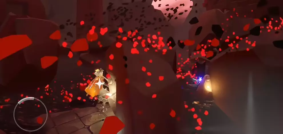 进入伊甸后,你会发现环境充满危险,红石雨和冥龙是主要威胁。第一阶段红石雨有间隙,每次持续约6秒,趁间隙快速移动并躲在石块后。第二阶段红石雨不会停,必须顶着风险前进,尽量靠近石灯补充能量。遁地技巧在这里特别有用,可以避开大部分攻击,但要注意视角调整,避免掉入缝隙。如果被红石砸中导致心火熄灭,立刻返回已点亮的石灯处恢复,减少损失。