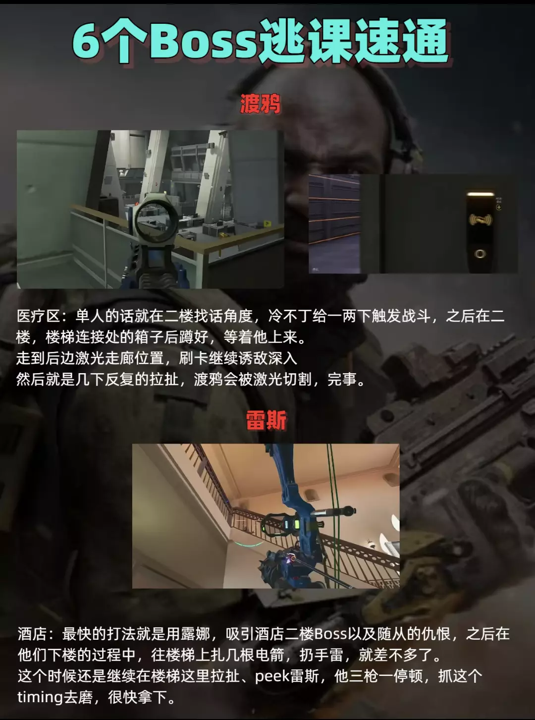 ▫医疗区单人版:先去二楼找角度蹭两下触发战斗,然后火速躲到楼梯连接处的箱子后面!等渡鸦上来的时候,慢慢拉扯到激光走廊,刷卡让激光帮你 “割” 它,反复几次就搞定,全程不用硬刚超省心~