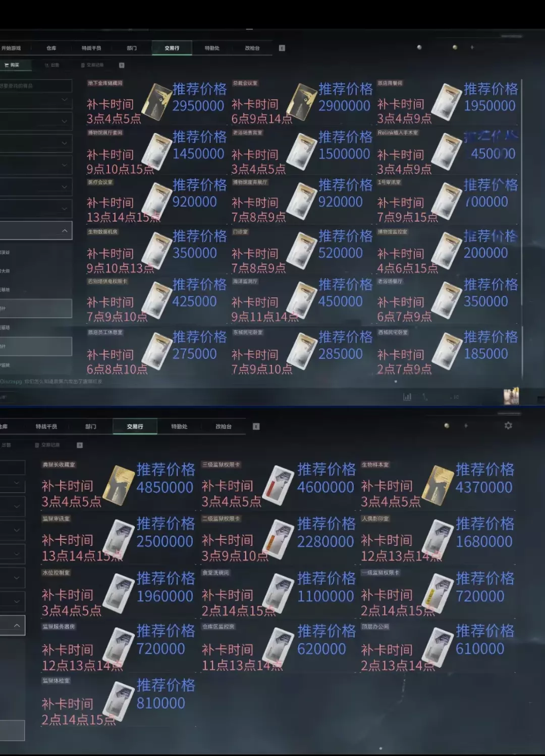 推荐价格均为保守推算(实际应该补货价格应该偏低,不过相差不多的话还是推荐果断入手)补卡时间为大致估算,可能存在2-8分钟误差。