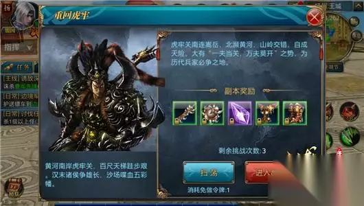 重回虎牢关 在度过前期之后,通主线任务获得的白色、黄色等低品质的装备已经不能满足战力提升的需要,此时就需要向品质更高的绿色装备甚至是紫色装备发起冲击。绿色装备最为主要的获取途径是主线任务以及重回虎牢关副本,重回虎牢关副本每日可以进入三次,每次通关副本可以获得大量的人物装备,包括绿色以及黄色品质的装备,此外,还能够获得可以打造紫色装备的紫色晶石。大量的装备不仅能帮助自身实现等级更高、属性更好的装备的更新,多出来的绿色装备还能通过装备合成功能提升成更高属性的绿色品质装备。在装备达到绿色极品后,虽然有一定的几率将装备打造成紫色品质,但1.5%的概率显得微乎其微。