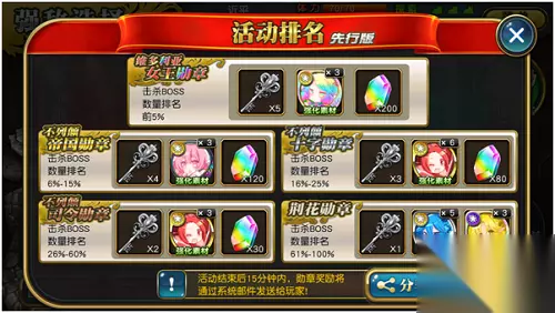 而随着参与人数的增加,玩家们还能够获得更丰厚的奖励以及更刺激的战斗体验哦。世界BOSS的奖励分为每场战斗奖励和活动结束后的排名奖励两种,每场战斗结束后都可以获得类似常规副本的战斗奖励,主要是强化经验素材和金币素材,同时活动结束以后会根据你击杀的BOSS分身数量的排名。奖励是根据百分比结算的,所以参与的玩家越多,能够晋升到前面阶段的机会就越大。只要努力,就能获得丰厚的回报哦!