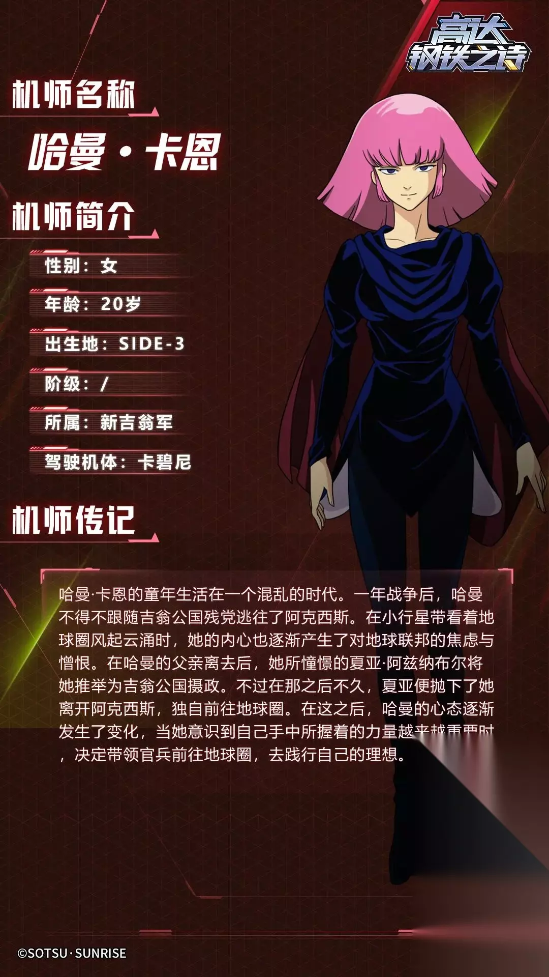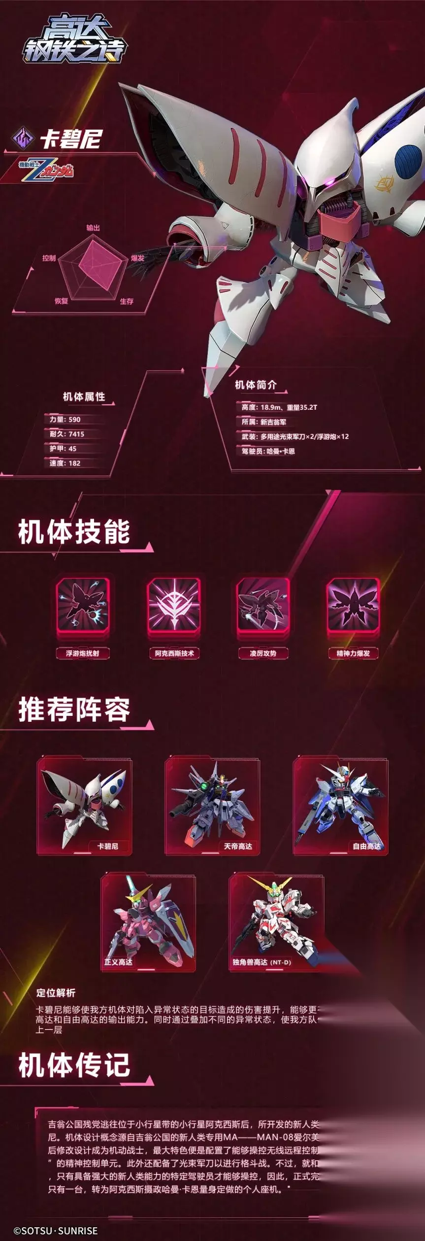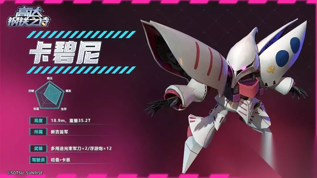 高达钢铁之诗攻略丨统御新吉翁的白色女王——卡碧尼如下: 各位指挥官: 大家好!今天的机体博物馆要为大家介绍的是《机动战士Z高达》中的角色“哈曼·卡恩”所驾驶的机体卡碧尼。 机体概况