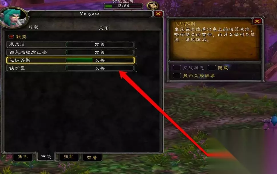 方法二:捐布 1、在达纳苏斯坐标(64,23)处找到npc联盟布匹军需官【莱顿暗影】; 2、向他捐布,亚麻布、丝绸、符文布都是可以捐赠的,捐赠后会提升声望。 注:推荐做完任务再去捐布,会比较省钱