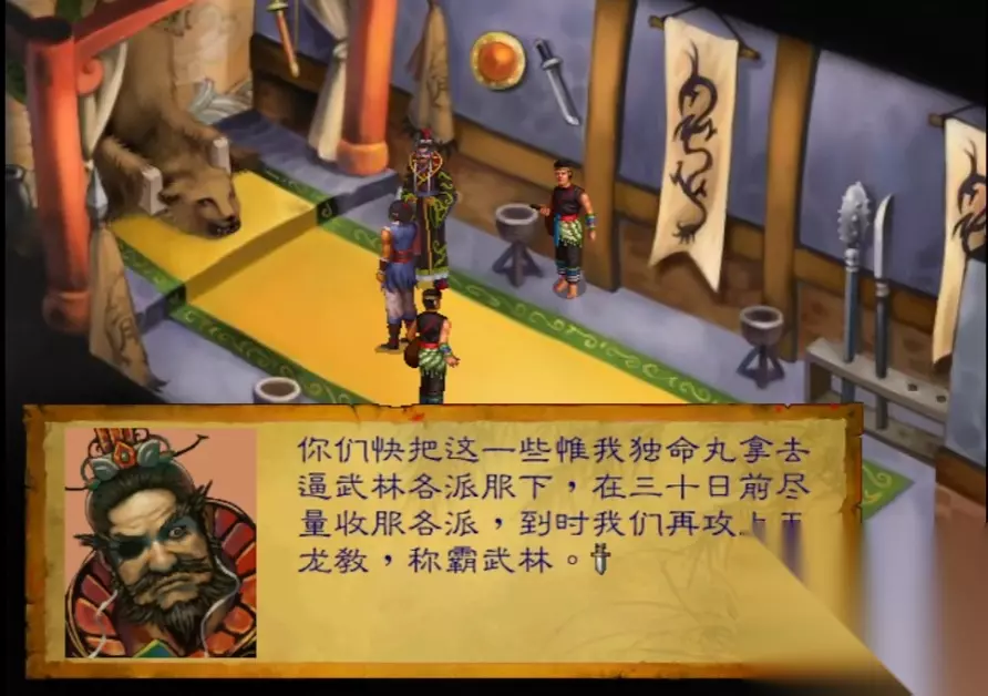 游戏中最麻烦的过程就是跑大地图。由于时间限制,第一次没能搞清楚方向。最后干脆去客栈睡了半个月,就成了乞丐。 游戏中最好的路线其实是“天王路线”:从少林寺救出天王后,整顿军政,进入魔教,打败“龙王”。终于,突破了武林人士的重围后,他凭借一番大道理,成功阻止了战争。