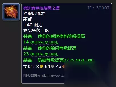 亵渎者萨拉德雷之握:常驻40耐力,使你的盾牌格挡等级提高14.,使你的躲闪等级提高23,防御等级提高27。很显然有关盾牌格挡、躲闪等级的装备为坦克职业的专属,非常适合防骑拿来顶满102.4的免碾压属性。