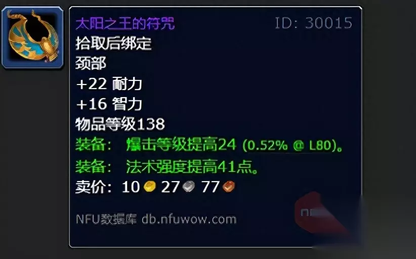 太阳之王的符咒:常驻22耐力,16智力,装备后暴击等级提高24,法术强度提高41点。这件装备毫无疑问是法师、术士等法系DPS的毕业项链,和P1阶段的“灵魂窃取项链”对比,太阳之王的符咒多出了1点法术暴击和13点法术强度,这个差距约等于两个宝石插槽的水平。