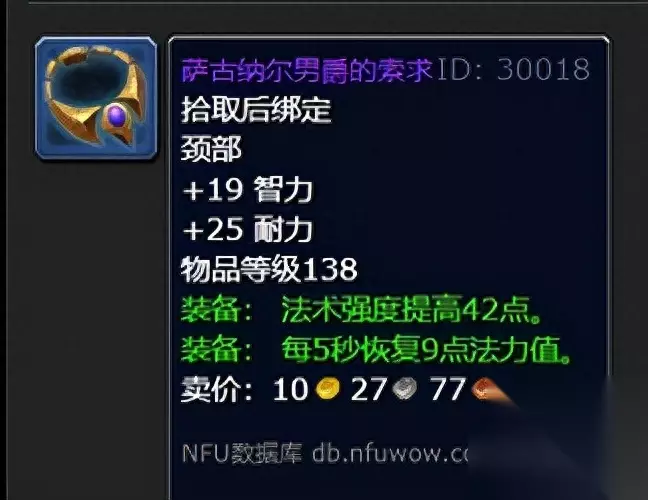 萨古纳尔男爵的索求:常驻19智力,25耐力。装备后法术强度提高42点,每5秒恢复9点法力值。恢复法力值的特效十分契合奶妈职业,同时回蓝属性也是这件装备最大的特点,为奶妈职业的长时间战斗能力提供了续航保障。
