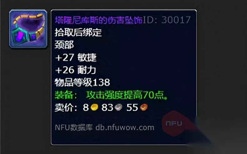 塔隆尼库斯的伤害坠饰:常驻27敏捷,26耐力,装备后攻击强度提高70点。简单粗暴的主属性以及攻击强度可以直观地提高输出质量,十分适合如盗贼、猫德等近战DPS职业选择。
