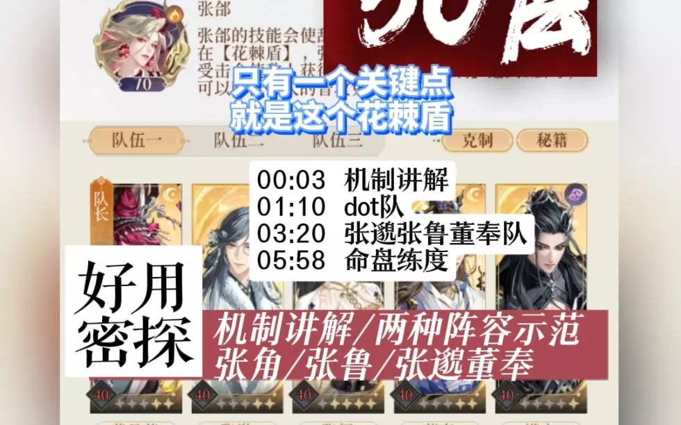 【利用花棘盾 保护密探】 【机制】: ①张郃普攻回合,为2/4号位,附加一层花刺。 ②张郃开大时,一层花刺的密探,会附加花棘盾。 【无一层花刺(紫色眼睛1),则…