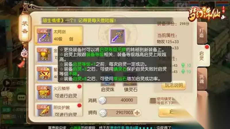 灵装启灵 启灵时需要用到1个对应品质的精粹、一定数量的启灵箓及铜钱,启灵箓可以通过天玄宝图获得,或在商行购买,价格较高。 启灵时所需的启灵箓数量和铜钱与灵装品质有关,如启灵摇光宝链/宝衣需要8个启灵箓和16W铜钱,启灵日耀链/甲需要4个启灵箓和8W铜钱,由此可推月灵装和星辉装应该是分别需要2个+4W和1个+2W。 启灵必定能使灵装获得属性词条加成,与装备一样,有单加、双加和加减,属性的最小最大值与灵装品质有关。 启灵还有小概率使日耀甲和摇光宝衣获得以下类型额外特效:火系亲和、冰系亲和、毒系亲和、电系亲和、水系亲和、物理防护、法术防护。 启灵有较小概率使双技能日耀/摇光宝链获得以下类型额外特效:猛击、潜力、激昂、明心、通明、护盾。