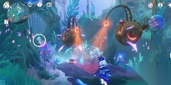 (32)与两侧的蓝色章鱼对话,跟随他们上去,放出鱼钩,把两个机械鱼引开就能获得里面的神瞳了