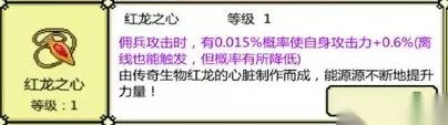2、红龙之心一级属性: 佣兵攻击时,有0.015%的概率使自身攻击力+0.6%(离线能够触发,但概率有所降低)。 3、由传奇生物红龙的心脏制作而成,能源源不断地提升力量。