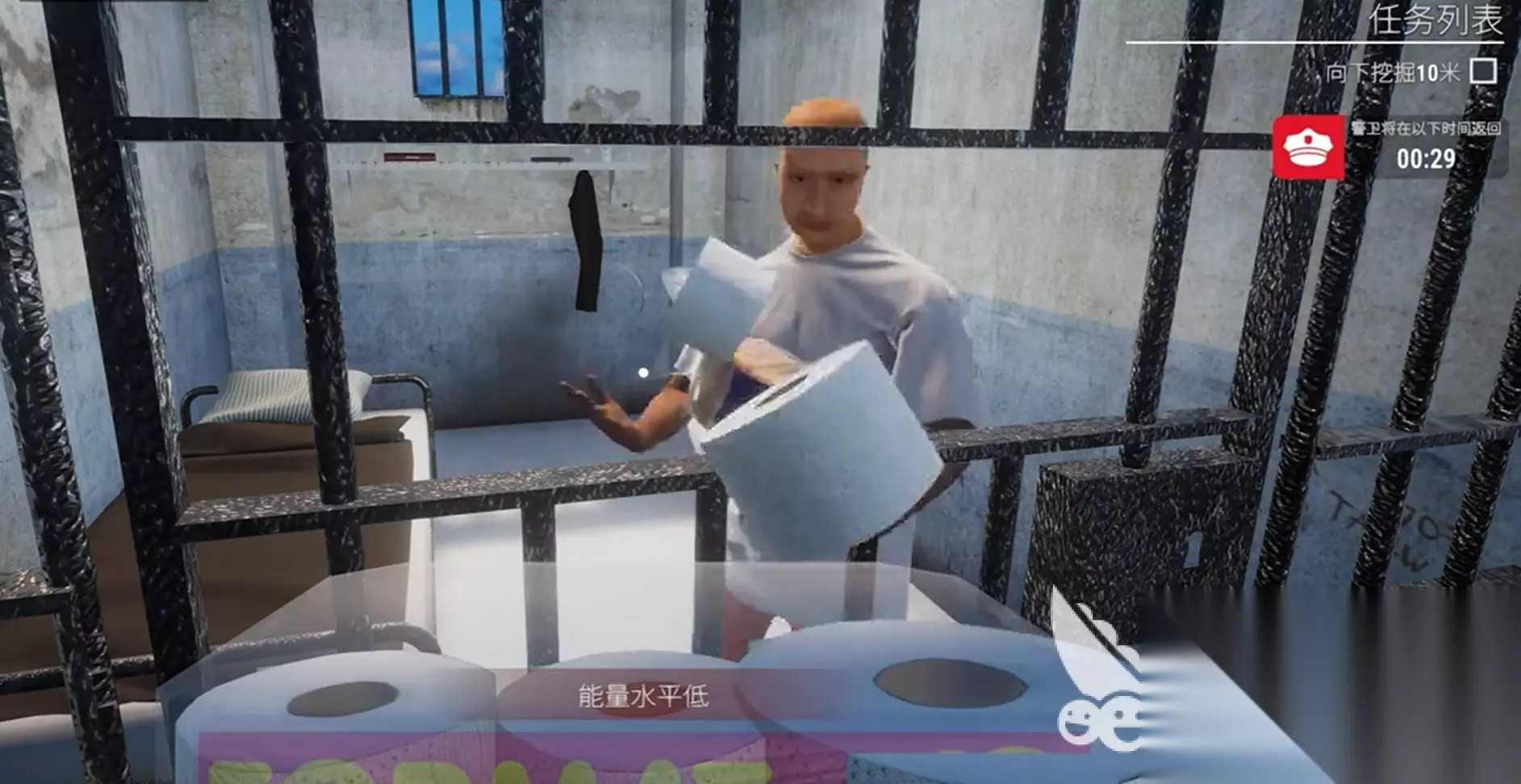 挖隧道是一个非常庞大的工程,玩家每次挖掘都会消耗大量的体力值。当体力值见底以后你就不能再挖掘了,所以想要尽快的挖掘出一条隧道,那么你最好找到一个趁手的工具。每天中午吃饭的时候,玩家可以多拿一双筷子和一个勺子。再回到监牢以后,玩家只需要掀开这里的地毯就可以挖掘隧道了。挖掘隧道会发出巨大的声响,所以小伙伴们每次挖掘一段时间,都要将头伸到监牢外面探望,一旦玩家在挖掘隧道的时候被警察发现,那么这局游戏就会直接结束了。