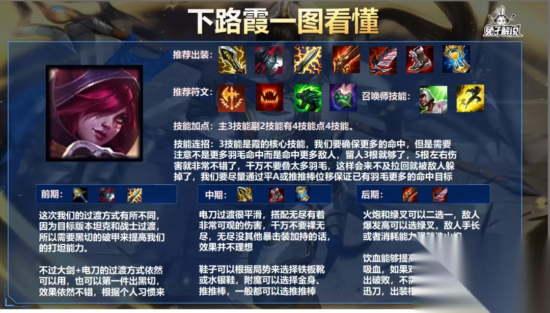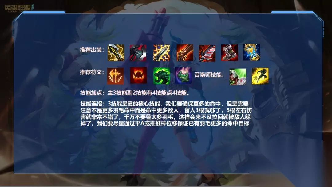 出装方面: 我们可以根据情况来选择自己的着装。如果对手太脆弱,我们就不能使用黑斩。如果我们面对硬支援,我们可以使用裸黑切。这样我们的输出就不会特别斗志旺盛,小团战也能有很好的爆发。 之后可以选择大剑+电刀的过渡方式,电刀也可以灵活更换为太阳刀。我个人认为用电刀开发会更舒服。太阳刀一般适合队伍伤害非常不足的时候。我们也可以用电刀作为过渡,后期再把电刀换成太阳刀,增加伤害。 最终选择有多种:迅刀、绿叉、饮血、火炮、破阵、蓝剑、低语、复活甲,如果缺CD可以选择迅刀、蓝剑,也可以选择低语、破阵、还有咬碎肉。皮肤,选择火炮,喝血。为了保命,你可以选择绿色十字和复活甲。 推荐天赋: 目前最好的天赋只有征服者,叠加起来可以大大提高我们的持续输出能力。 猎人吸血比其他小天赋更适合霞。它不仅有攻击力,还有吸血能力。 自适应外壳可以提高我们的宽容度 水果和猎人天才可以根据个人的游戏风格来选择 技能连招: 技能3是夏的核心技能。我们需要保证更多的命中,但需要注意不是击中更多的羽毛,而是击中更多的敌人。保留3根羽毛就够了,5根羽毛左右的伤害就很不错了。当心。不要堆放太多羽毛,否则你还没来得及把它们拉回来,就会被敌人闪避。我们应该尽量通过调平A或者推动推杆的位移来保证更多的羽毛击中目标。 对局详解