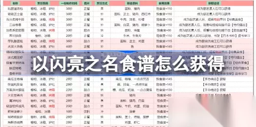 以闪亮之名中玩家可以通过各种方式获得食谱,有玩家在问以闪亮之名食谱怎么获得,下面小编给大家带来以闪亮之名全食谱获取攻略,往下看吧。