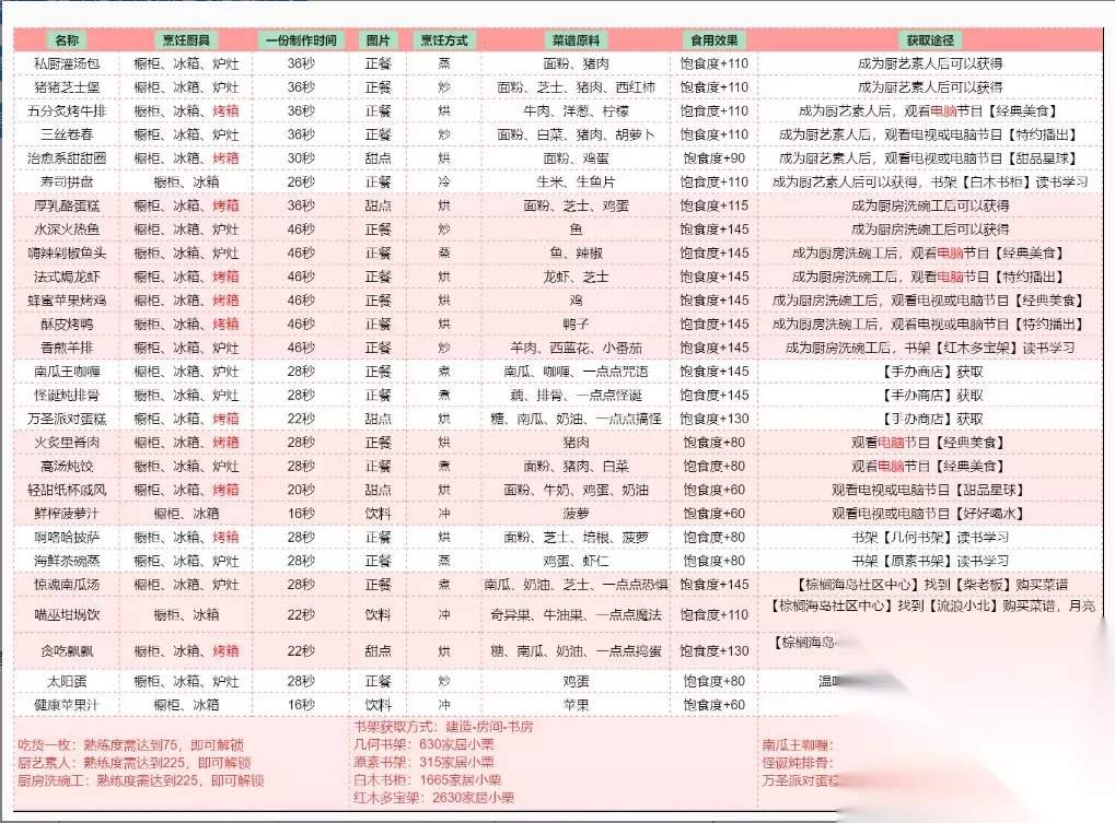 以闪亮之名食谱怎么获得 全食谱获取攻略 私厨灌汤包:成为厨艺su人后可以获得 海鲜茶碗蒸:书架【原素书架】读书学习 嗨辣剁椒鱼头:成为厨房洗碗工后,观看电脑节目【经典美食】 南瓜王咖喱:【手办商店】获取 怪诞炖排骨:【手办商店】获取 惊魂南瓜汤:【棕榈海岛社区中心】找到【柴老板】购买菜谱 高汤炖饺:观看电脑节目【经典美食】 猪猪芝士堡:成为厨艺su人后可以获得 太阳蛋:温暖的太阳蛋,是记事起就会做的美味 香煎羊排:成为厨房洗碗工后,书架【红木多宝架】读书学习 水深火热鱼:成为厨房洗碗工后可以获得 三丝卷蠢:成为厨艺su人后,观看电视或电脑节目【特约播出】 啊咯哈披萨:书架【几何书架】读书学习 火炙里脊肉:观看电脑节目【经典美食】 蜂蜜苹果烤鸡:成为厨房洗碗工后,观看电视或电脑节目【经典美食】 法式焗龙虾:成为厨房洗碗工后,观看电脑节目【特约播出】 五分炙烤牛排:成为厨艺su人后,观看电脑节目【经典美食】 酥皮烤鸭:成为厨房洗碗工后,观看电视或电脑节目【特约播出】 寿司拼盘:成为厨艺su人后可以获得,书架【白木书柜】读书学习 万圣派对蛋糕:【手办商店】获取 贪吃飘飘:【棕榈海岛社区中心】找到【夜猫猫】购买菜谱,周五~周日的午夜之后、凌晨之前出现 厚乳酪蛋糕:成为厨房洗碗工后可以获得 轻甜纸杯戚风:观看电视或电脑节目【甜品星球】 治愈系甜甜圈:成为厨艺su人后,观看电视或电脑节目【甜品星球】 鲜榨菠萝汁:观看电视或电脑节目【好好喝水】 健康苹果汁:吃货一枚,从出生起就会做了! 喵巫坩埚饮:【棕榈海岛社区中心】找到【流浪小北】购买菜谱,月亮升起时出现