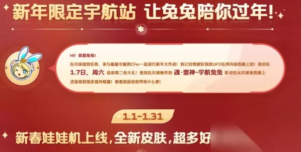 穿越火线拜年口令码一览2023 一、活动介绍 活动:新春娃娃机 时间:1月7日-1月31日 B站口令:暂无,1月7号更新 暗号:宇航兔迎枪神 俱乐部拜年码:AG666 二、兑换码使用方法 1、点击活动地址,进入新春娃娃机活动页面。