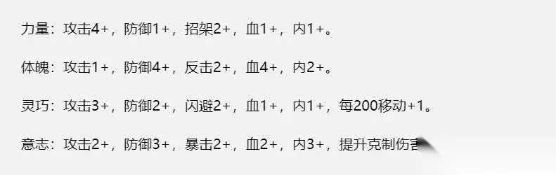 学【剑】主【意志】/【灵巧】 学【刀】主【力量】/【灵巧】 学【拳】主【力量】/【体魄】 学【腿】主【灵巧】/【体魄】 学【扇】主【灵巧】/【意志】 学【棍】主【体魄】/【意志】 PS:天赋特长一般推荐【习武天才】,这样获取武学经验有额外加成,能够尽快将战力成型。需要注意的一点是,3月结业前各项属性需要达到30点,所以开局属性点分配不能全点侧重,至少要分配10点出来加在剩下两项的属性上。