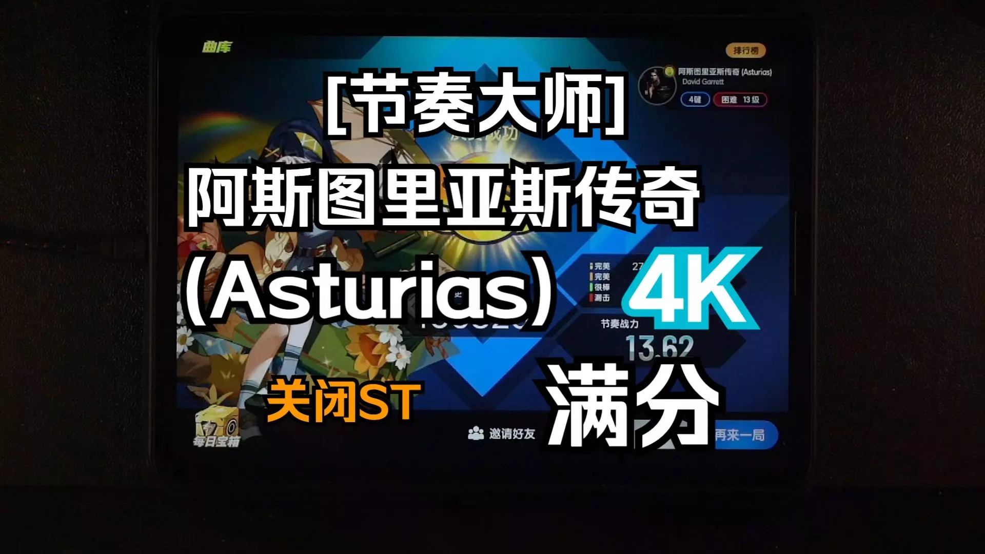谱面入口:专辑挑战-诸神黄昏-第五首 平均难度预估:~ex2/alpha+ 轻松拿下预估:ex6+ (天赋比准度比除外) 考察方向:侧重键盘4K力 本次节奏大师…