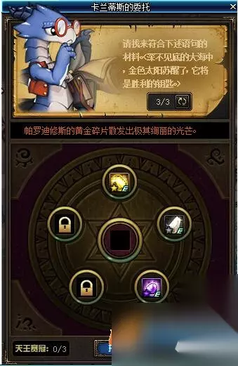 2、在这段语句中,出现黄金或金色的字眼就代表我们需要放入1个帕罗迪修斯的黄金碎片,出现太阳或阳光的字眼时就代表我们需要放入1个帕罗迪修斯的太阳石,出现月亮或者月光的字眼时就代表我们需要放入1个帕罗迪修斯的月光石,出现家园或者银河的字眼时就代表我们需要放入1个帕罗迪修斯的银河石,出现大海或海洋的字眼时就代表我们需要放入1个帕罗迪修斯的深海石。这样你就能够合成成功了!
