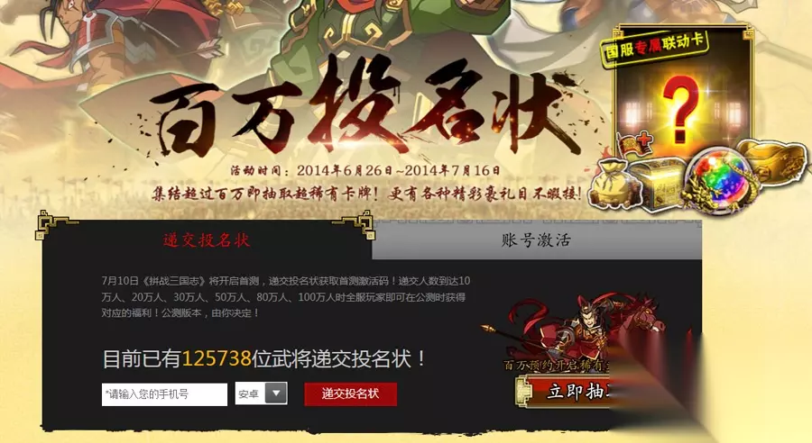 你以为这样就算完?还远远不够!“百万投名状”活动会一直持续到7月16日,按照目前玩家的热情,突破50万、 100万指日可待!如果活动参与人数突破100万大关,除了上述福利全数奉上外更有升级大礼:全服玩家背包格数直接增至30;全服玩家体力冷却时间缩短至7分钟;全部玩家体力上限增加5点;全服玩家PVP冷却时间缩短至20分钟。除此之外,官方还将开启预抽卡活动,100%获得公测稀有武将!这样敢送敢当的良心官方,放眼望去只在《拼战三国志》!还等什么,快快登陆游戏官网预定首测激活码吧!