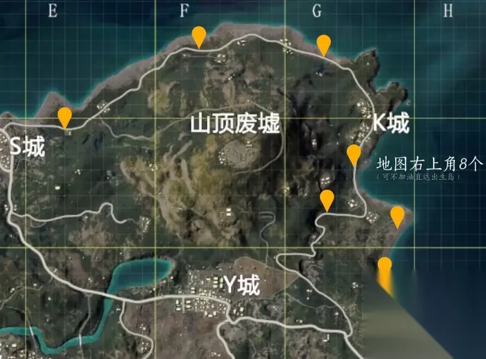 位置四:山顶废墟附近:包括S城、Y城、K城(8个)