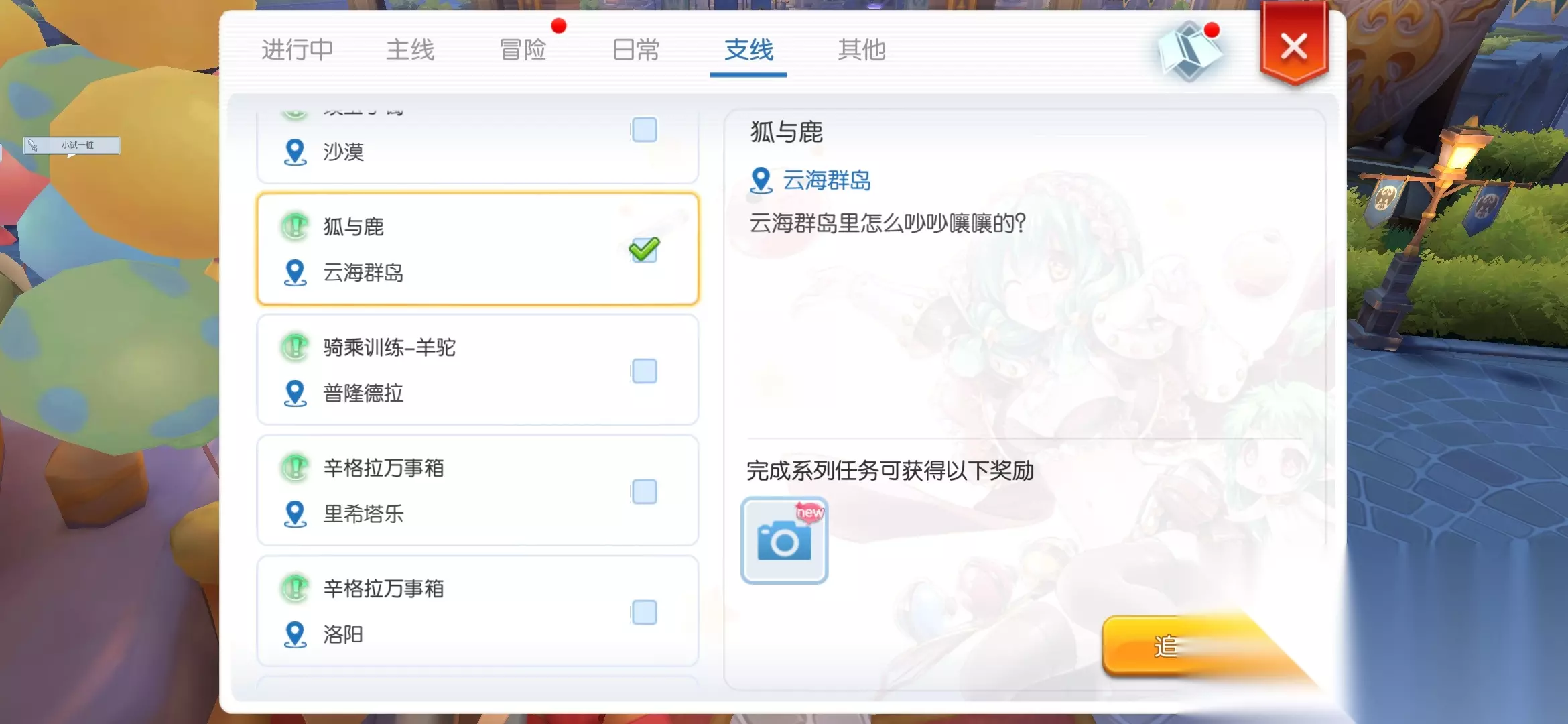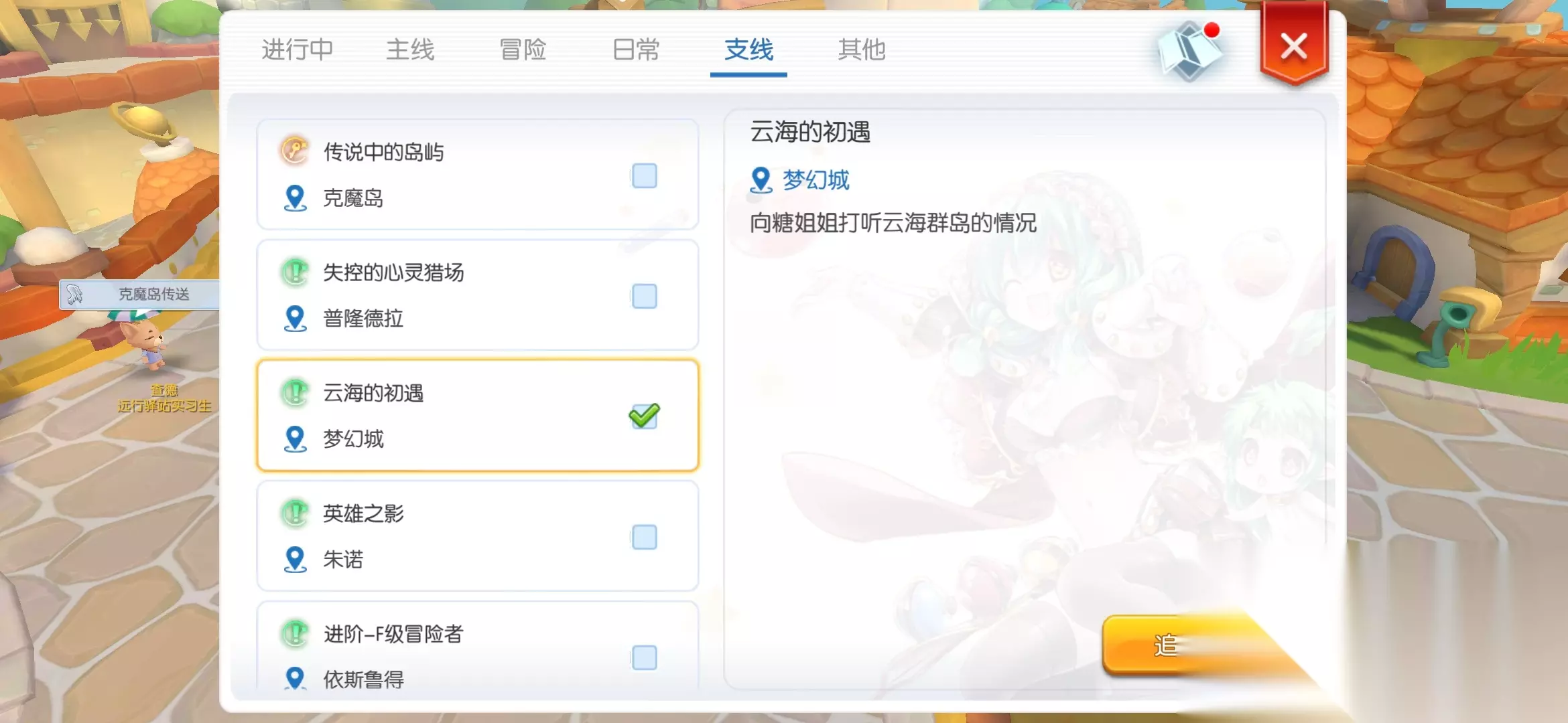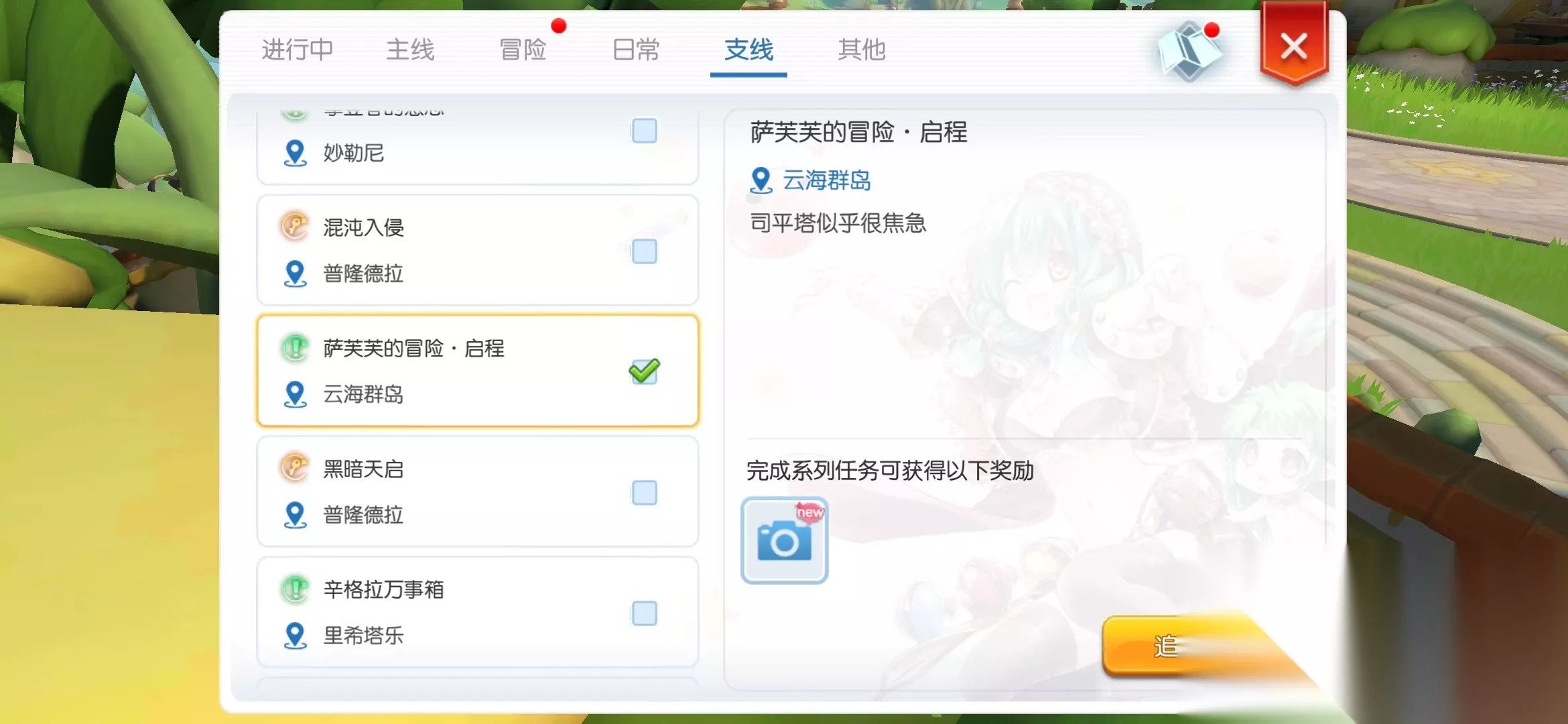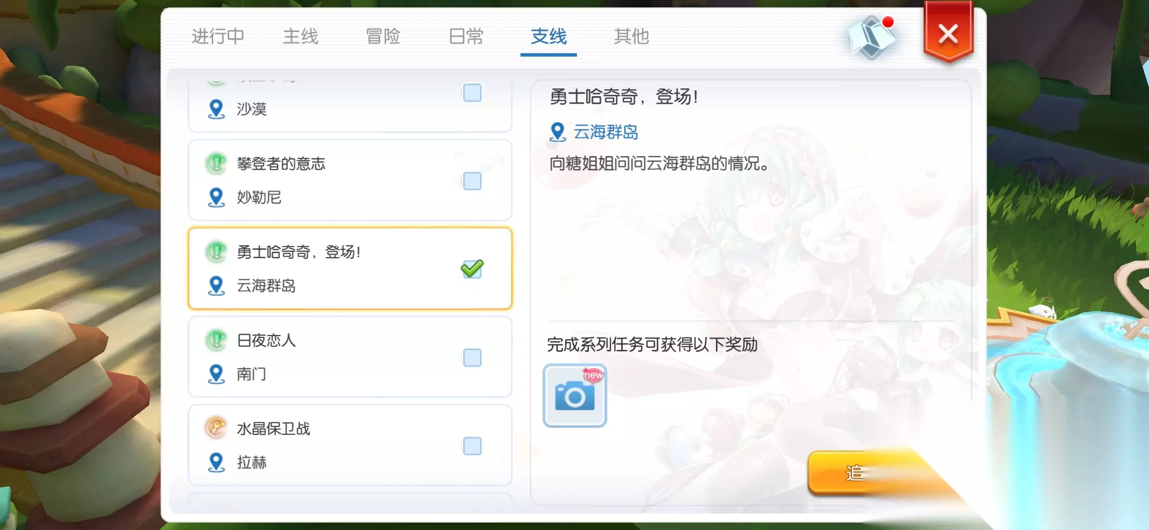 此时在任务栏支线任务中才可以找到新的绿色任务【云海的初遇】