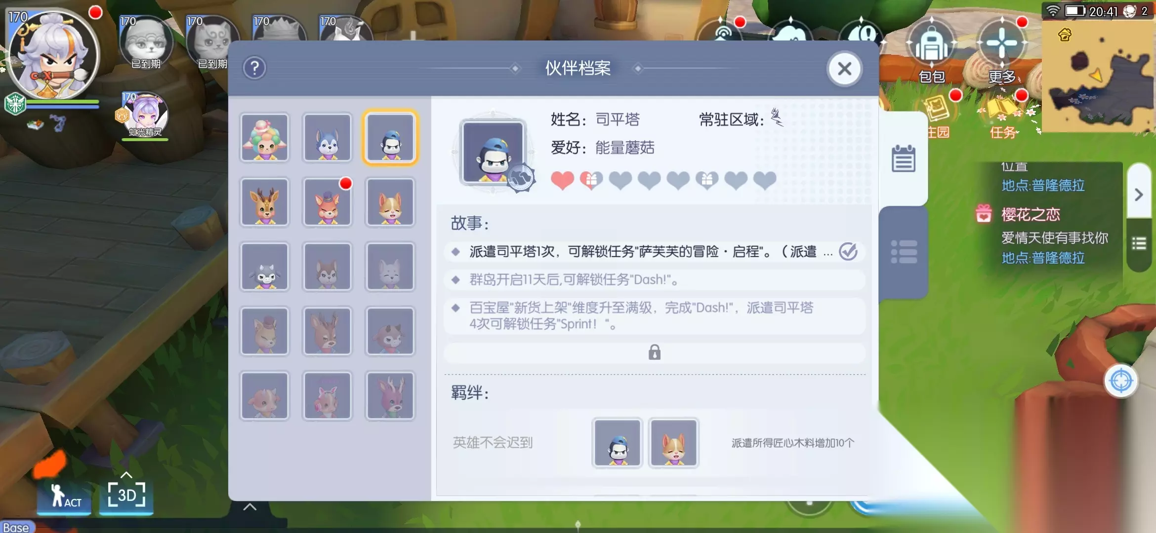 主要是介绍各种功能和小动物。 狐狸是商店,商店关系到云海群岛和每周个人提高。 鹿是缆车,缆车关系到主线剧情,派遣的人物关系到支线剧情解锁。 缆车和哨所的武器形成联动,对应地图的人物⭐和武器⭐同时探索概率解锁群岛小动物的好感度道具,第一次解锁的道具后可以去云海商店购买 派遣每天一次,解锁后最多3次。每次5小时,所以需要在庄园注意各类人物解锁是否需要派遣,避免卡进度