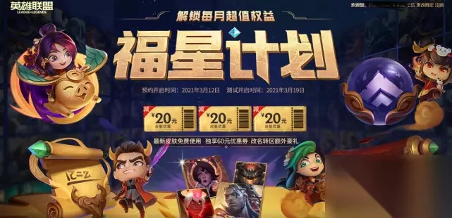 LOL福星计划 福星计划从2021年3月份开始推出,还是测试阶段,其原价68元/月,测试期是60元/月,可以知道的是,我们花了六十大洋解锁了福星计划后,就可以得到上图所描述的奖励:最新皮肤免费使用,独享60元优惠券,下面让我们一起来分析其存在的合理性。 1.最新皮肤免费使用