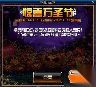 点亮装扮: 1 活动期间,每日登陆即可点亮一次赛丽亚房间内的装饰 2 每次点亮一个装饰,可以获得5个【糖果】 3 总共可以点亮7次,点亮完成后可以获得【万圣节武器装扮礼盒】 获得糖果: 1 活动期间,在推荐地下城内,勇士们可以获得【糖果】,每日每账号最多获得20个 2 可以把【糖果】交给赛丽亚换取如下奖励