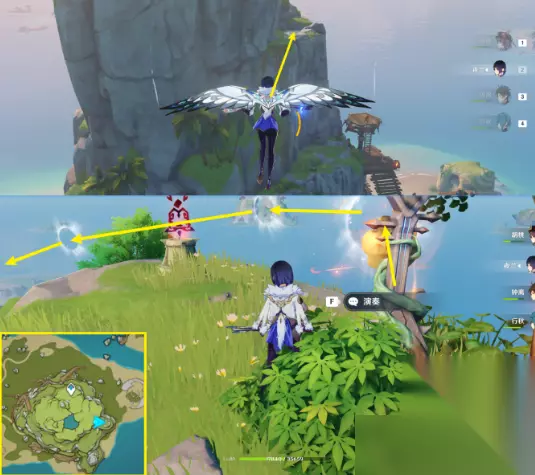 【②】左上岛屿上方通过眼前的风车召唤风场飞上去。 (8)疏通岛屿水脉 【①】右侧岛屿下方。完成「音奏踏板」后解锁「音律树琴」后直接演奏即可。