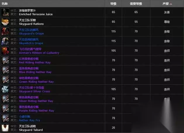 大家好哈。 TBC怀旧服开放P2的同时,也开放了两种新的声望坐骑,虚空鳐和虚空幼龙,两者分别需要对应的声望刷到崇敬才能购买。 只是虚空幼龙阵营的声望任务又复杂,又冗长,刷起来实在很麻烦。 与之相比,虚空鳐所需的天空卫队声望任务反而比较清楚,是一套重复任务链,值得玩家们刷一刷。 下面就让我们来看看天空卫队声望该如何刷吧。